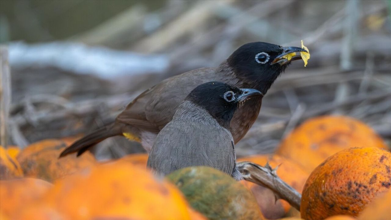 Ağaç diplerinde kalan meyveleri yiyen kuşlar, kamerayla kaydedildi.