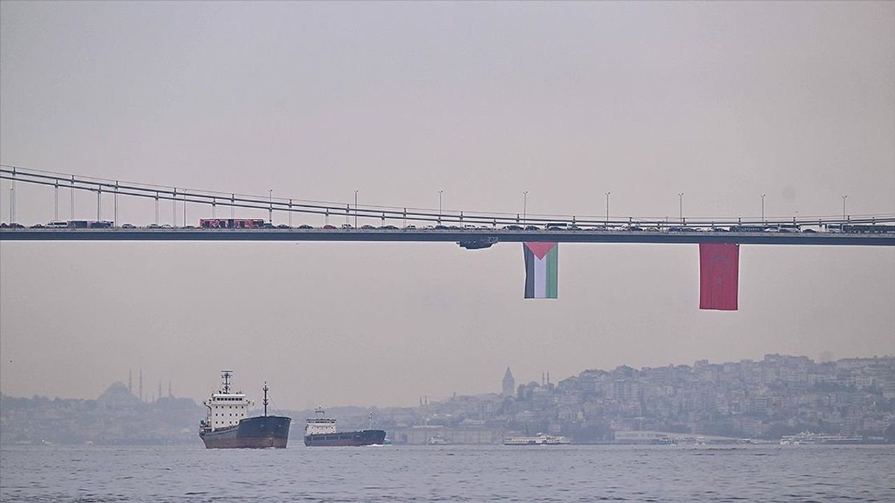 Asya ve Avrupa kıtalarını birbirine bağlayan köprülerde dalgalanan bayraklar, drone ile havadan da görüntülendi.
