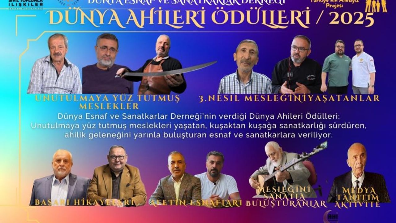 Dünya Esnaf ve Sanatkarlar Derneği -Ahi Enstitüsü tarafından yürütülen ve İçişleri Bakanlığı Sivil Toplumla İlişkiler Genel Müdürlüğü tarafından desteklenen ‘Anadolu’nun Ahisiyiz, Türkiye’nin Ailesiyiz’ projesi kapsamında verilen ödüller, esnaf ve sanatkarlar için önemli bir yere sahip oldu. Ödüller, Unutulmaya Yüz Tutmuş 3 Nesil Mesleğini Yaşatanlar, Mesleğini Sanatla Buluşturanlar, Başarı Öyküleri, Afet’in Esnafları, Medya Tanıtım ve Aktivite Alanları olarak 6 ana kategoride dağıtıldı.
