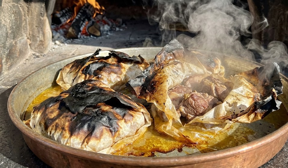 Kâğıda Hapis: Yağlı kâğıdın ortasına eti koyun, üzerine cömertçe bir parça kuyruk yağı ekleyin. Kâğıdı hava almayacak şekilde sıkıca paketleyin.