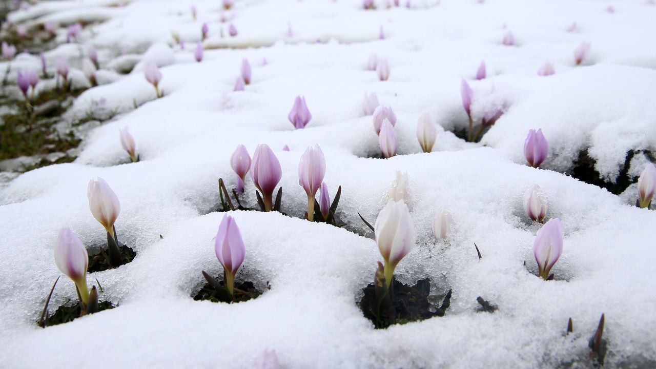 Muş Ovası'nda açan 'baharın habercisi' çiğdemler, kar yağışının ardından beyaz örtü altında kaldı.