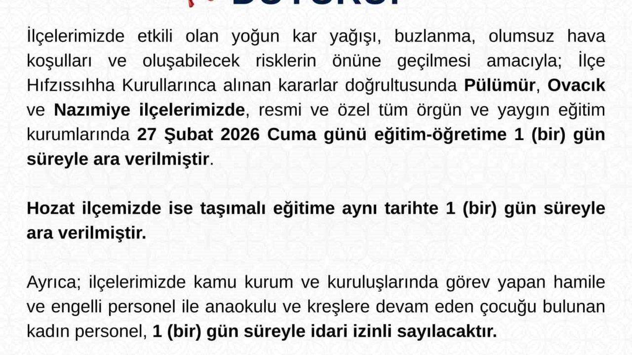 Tunceli Valiliğinden yapılan açıklamada, 'İlçelerimizde etkili olan yoğun kar yağışı, buzlanma, olumsuz hava koşulları ve oluşabilecek risklerin önüne geçilmesi amacıyla; İlçe Hıfzıssıhha Kurullarınca alınan kararlar doğrultusunda Pülümür, Ovacık ve Nazımiye ilçelerimizde, resmi ve özel tüm örgün ve yaygın eğitim kurumlarında 27 Şubat 2026 Cuma günü eğitim-öğretime 1 gün süreyle ara verilmiştir. Hozat ilçemizde ise taşımalı eğitime aynı tarihte 1 gün süreyle ara verilmiştir. Ayrıca ilçelerimizde kamu kurum ve kuruluşlarında görev yapan hamile ve engelli personel ile anaokulu ve kreşlere devam eden çocuğu bulunan kadın personel, 1 gün süreyle idari izinli sayılacaktır' denildi.